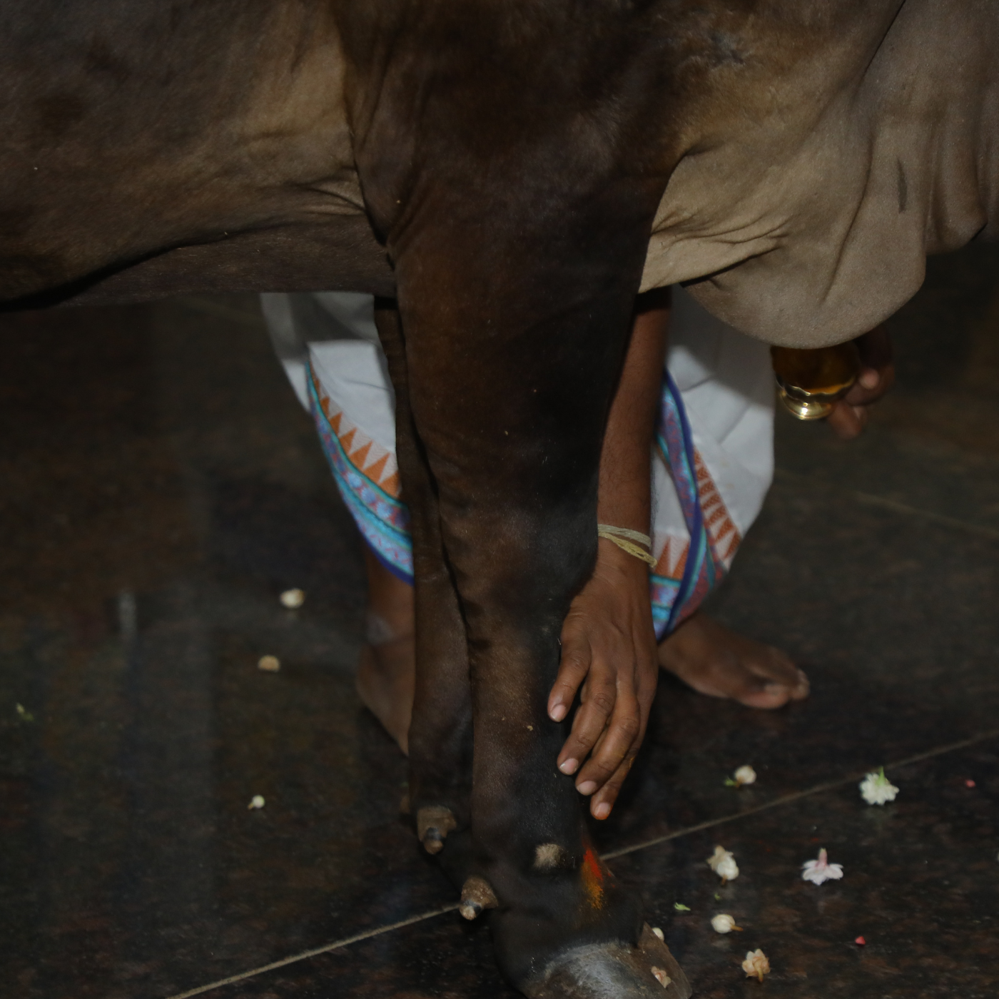 This act symbolizes reverence, honoring the cow as a symbol of divine presence.